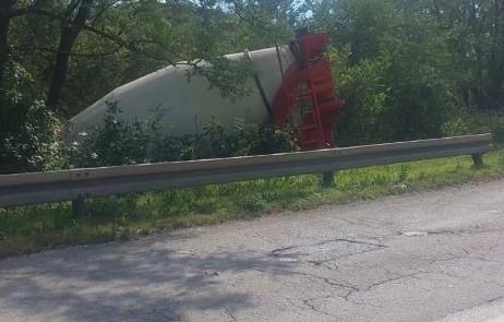 Cisterna betonirka je od siline udara sletela sa puta a delovi automobila su rasuti po putu.