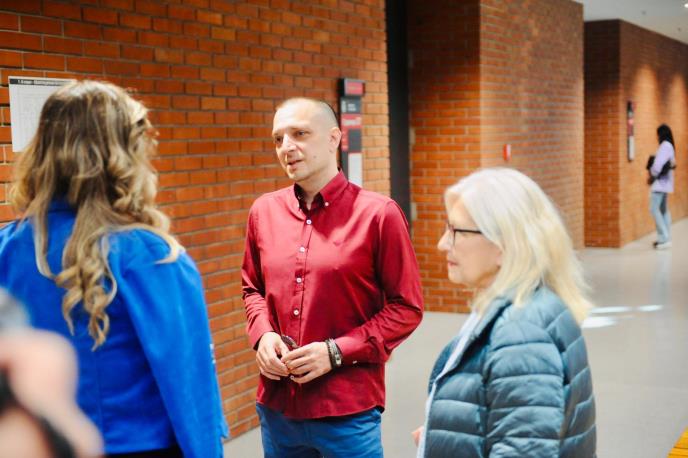 Marjanović je danas ispred sudnice uslikan sa kuma Verom i Teodorom Krsmanović, sestrom ubijene Jelene Krsmanović Marjanović.