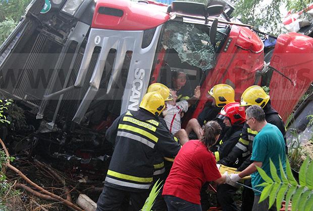 Vozača su iz smrskane kabine vatrogasci izvlačili skoro dva sata, uz stalni nadozor lekara iz Hitne pomoći, koji su mu već u kabini priključili infuziju.
