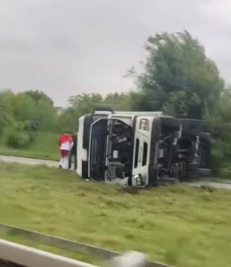 Jedan kamion se prevrnuo na starom novosadskom auto-putu u Zemun polju, u smeru ka Beogradu.
