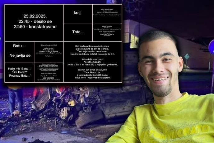 Mladić Bata Češljarov (23) iz Zrenjanina poginuo je u februaru u stravičnoj saobraćajnoj nesreći kada se "audijem" pri velikoj brzini prvo zakucao u semafor, a zatim udario u drvo pokraj puta. Tuga, bol i čežnja koju oseća njegova porodica je neobjašnjiva, a na društvenim mrežama neutešna sestra opisala je kobno veče.