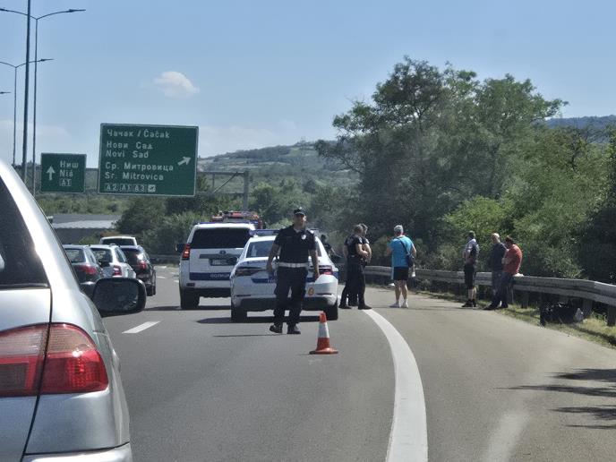 Pored puta se nalazi olupina jednog vozila, a na terenu su policajci i vatrogasci.