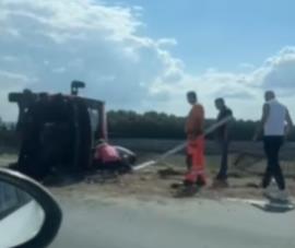 Kako se vidi na snimku podeljenom na društvenim mrežama, kamion je ostao prevrnut na bok, dok je srča svuda po putu.