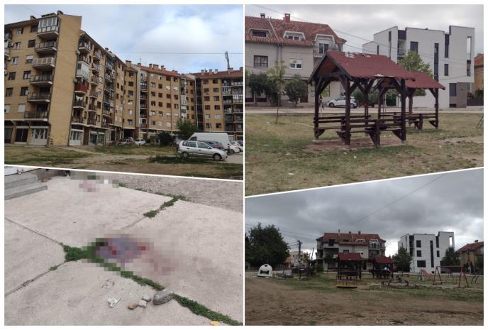 Krvave kese i gaze podsećaju prolaznike da se sinoć ovde dogodilo ubistvo. Kako saznajemo, pretpostavlja se da su ubijeni i osumnjičeni za ubistvo sinoć sedeli zajedno u letnjikovcu u parkiću ispred zgrada.