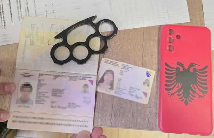 Pregledom lica, kod M. S. pronađen je metalni bokser i PVC maska za telefon sa simbolima zastave Albanije.