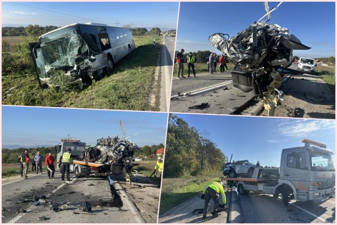 - Slike sa lica mesta su zaista jezive. Sudar je bio toliko silovit da je automobil potpuno smrskan. Autobus je od jačine udara sleteo sa puta i udario u stub dalekovoda, takođe je poprilično oštećen, kaže za RINU jedan od meštana.