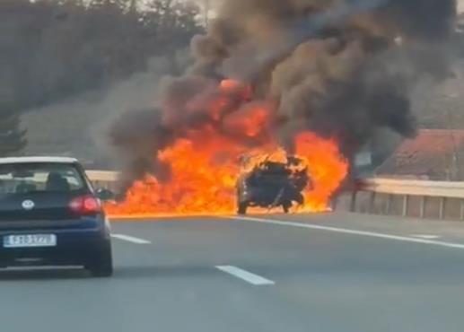 Jedno putničko vozilo je u potpunosti zahvatio plamen, a kako možete videti na snimku koji objavljujemo, gust crni dim se nadvija nad ovom saobraćajnicom