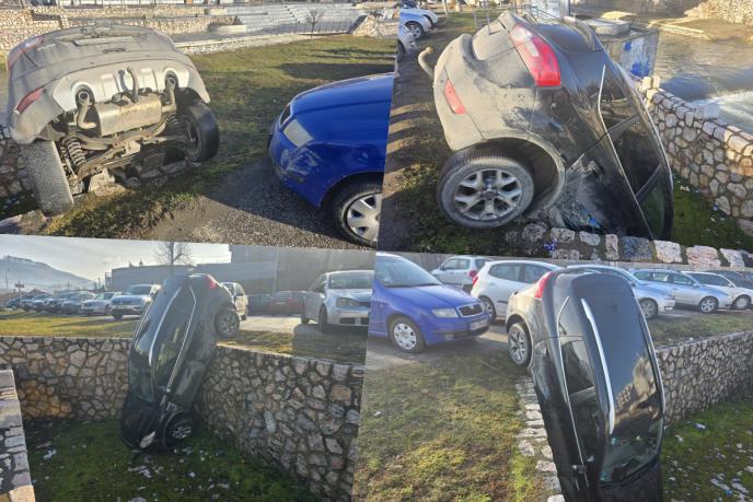 KARAMBOL NA PARKINGU HOTELA U NOVOM PAZARU! Džip visi na samoj ivici korita reke Raška, pogledajte fotografije (foto)