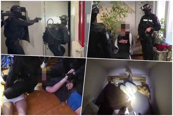 Kako se vidi na objavljenom snimku hapšenja, pripadnici UKP upali su u stan gde su zatekli osumnjičene u donjem vešu. Sva trojica uhapšena su iste sekunde.