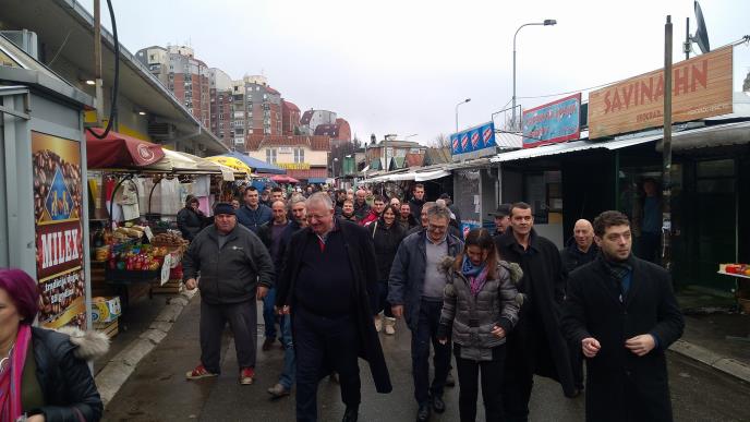 Kako je sopštila SRS, Šešelj i kandidat za gradonačelnika SRS Miljan Damjanović obišli su danas pijacu na Vidikovcu i razgovarali sa građanima.