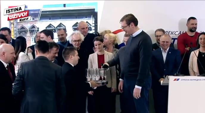 Nakon što je otvoren šampanjac u čast pobede SNS-a na lokalnim izborima krenule su da padaju i prve čestitke među okupljenima u sedištu te partije.