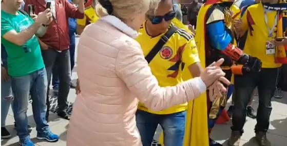 Jedna simpatična ruska „babuška“ nije mogla da odoli da se pridruži žurci koju su u centru Moskve napravili navijači Kolumbije.