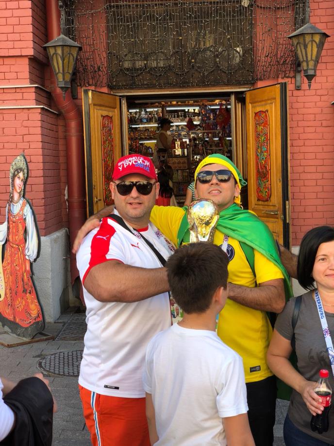 U Moskvi je tokom celog dana sjajna atmosfera, a navijači dva tima zajedno pevaju i čekaju vreme za polazak na stadion. U prevozu je jedan navijač Srbije iz Vrnjačke Banje bio sam među Brazilcima. Nije bio u opasnosti, uživao je zajedno sa njima, u pesmi i igri.