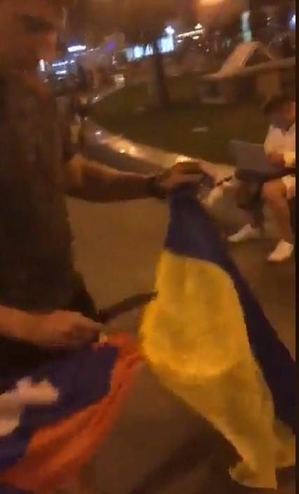 Najpre ih je pitao zašto u Kijevu nose zastavu Rusije, da bi posle žustre rasprave i više nasrtaja na momka, odeto, rusku zastavu, odvojio od ukrajinske i zatim je isekao.