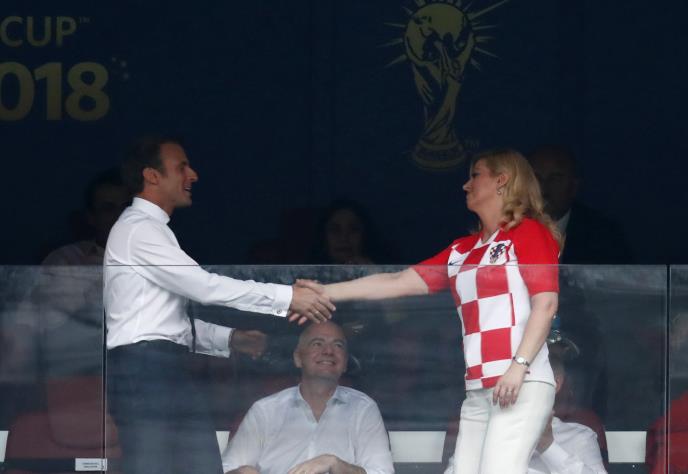 Fotoreporteri su spremni dočekali reakciju predsednice Hrvatske koja je posle gola ustala i pružila ruku Emanuelu Makronu kako bi mu čestitala vođstvo.