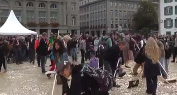 BERN - Švajcarci su u znak protesta na trgu ispred Parlamenta u Bernu doslovno prosuli 14 tona novca, tačnije 400.000 franaka u kovanicama od pet centi.