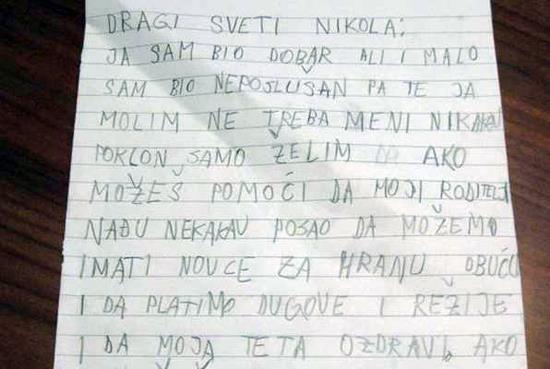 "Dragi Sveti Nikola: Ja sam bio dobar, ali i malo sam bio neposlušan pa te ja molim ne treba meni nikakav poklon - samo želim da ako možeš pomoći da moji roditelji nađu nekakav posao da možemo da imamo novac za hranu i obuću i da platimo dugove i račune i da moja teta ozdravi. Ako možeš to da mi ispuniši, biću jako zadovoljan. Živeo ti meni sto godina, srećne praznike želi ti tvoj Danijel".
