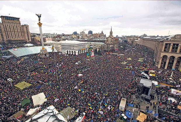 Stotine hiljada demonstranata u nedelju uveče srušile su statuu osnivača Sovjetskog Saveza Vladimira Lenjina u Kijevu, dok je ukrajinski predsednik Viktor Janukovič bio u poseti Rusiji. Opozicija i hiljade njihovih istomišljenika nastavljaju proteste zbog udaljavanja Ukrajine od EU i iznenadne saradnje s Rusijom. Rušenje Lenjinove statue podržao je švedski političar Karl Bilt.