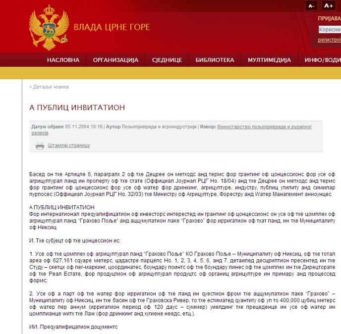 PODGORICA - Na zvaničnom sajtu vlade Crne Gore objavljen je "Javni poziv" investitorima koji su zainteresovani za korištenje javnog dobra "Grahovo polje" i akumulaciono jezero "Grahovo". Sve bi bilo u redu da tekst nije na engleskom jeziku napisanom na ćirilici.
