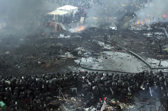 Policija koja je raspoređena oko kijevskog Trga nezavisnost, poznatog i kao Majdan, bacila je šok bombe i upotrebila vodene topove kao bi razbila protest, navodi agencija Asošiejtid pres. Hiljade pristalice opozicije uzvratile su "molotovljevim koktelima" i kamenicama braneći trg na kojem se okupljaju više meseci.U jučerašnjim sukobima u Kijevu je poginulo najmanje 26 ljudi.