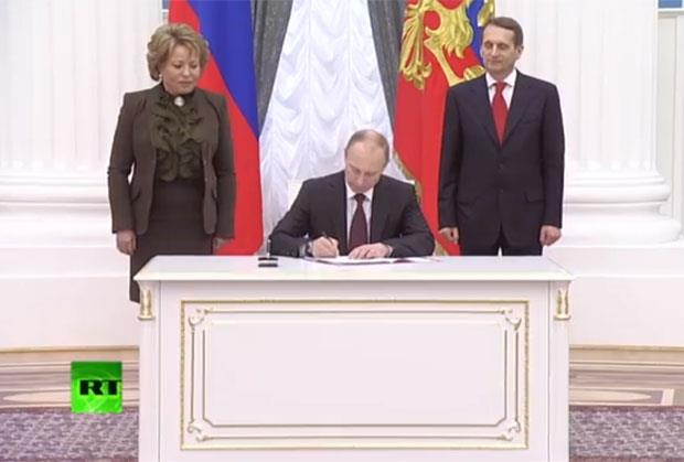 Na svečanosti u Kremlju, sa predsednicom gornjeg doma parlamenta Valentinom Matvijenko s desne i predsednikom donjeg doma parlamenta Sergejom Nariškinom s leve strane, predsednik Rusije je pred poslanicima oba doma parlamenta stavio na dokument istorijski potpis, posle kojeg su Krimljani i zvanično postali Rusi.