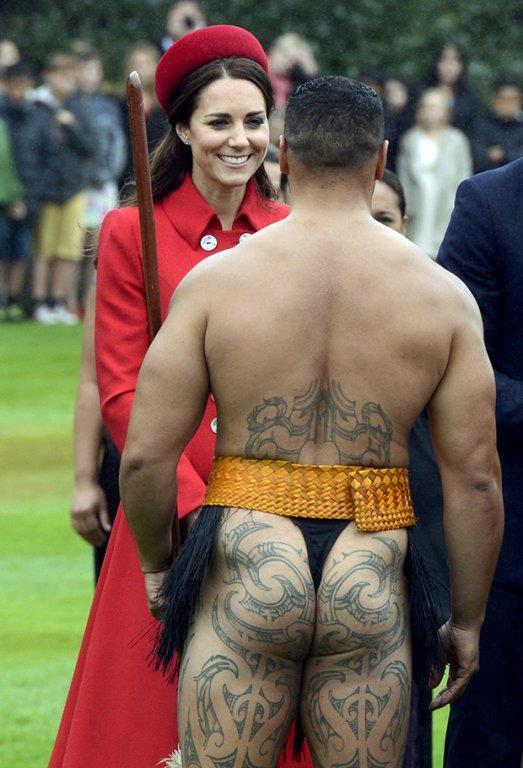 Put kraljevskog para na Novi Zeland trebalo je da protekne u znaku vesti da je to prvo zvanično putovanje osmomesečnog Džordža, sina Vilijama i Kejt. Međutim, to je palo u drugi plan jer su svet obišle fotografije na kojima se elegantna vojvotkinja od Kembridža stidljivo osmehuje dok stoji ispred ratnika obnažene zadnjice, uz to i istetovirane.