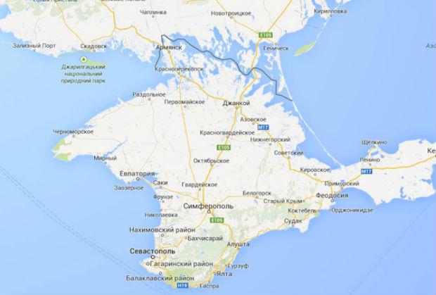 Na Guglovoj stranici sa mapama vidi se granica između Ukrajine i Krima sa imenima gradova i naselja na engleskom i ruskom jeziku, ali ne i ukrajinskom.