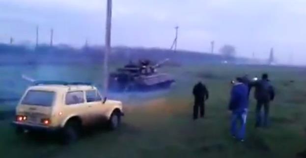 Na snimku se vidi kako proruski aktivisti jure tenk davajući instrukcije vojnicima da stanu i isključe motor