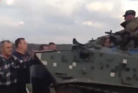 Njegova hrabrost se graničila sa ludilom jer vojnici nisu nimalo bili oduševljeni njegovim postupkom pa je jedan od vojnika kalašnjikovom zapucao mu iznad glave nadajući se da će on odustali, ali proruskog aktivistu to nije nimalo pokolebalo već je počeo da se kači po borbeno vozilu pešadije.