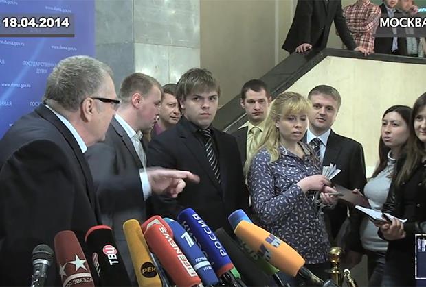 U jednom trenutku se javila i novinarka agencije Interfaks mu je rekla da je to ponižavajuće i pitala zašto to radi, dok je kontroverzni politčar povikao i na nju.