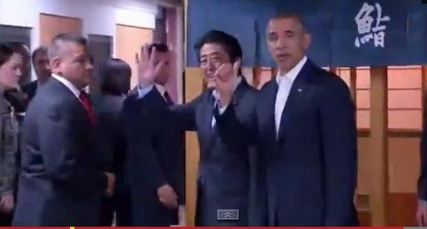 Japanski premijer Šinzo Abe odlučio je da za prvu večeru tokom Obamine posete Japanu odvede predsednika SAD u restoran kako bi razvio prijateljske odnose s njim. Međutim, Obama, poznat kao pragmatičan političar, odmah je počeo pregovore o trgovinskim odnosima između dve zemlje.