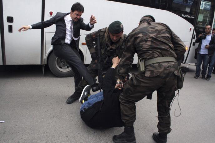 Turska štampa je danas objavila fotografije na kojima je prikazan savetnik Erdogana kako šutira demonstranta koji je na zemlji, dok ga drže pripadnici specijalnih policijskih snaga, preneo je AP.
