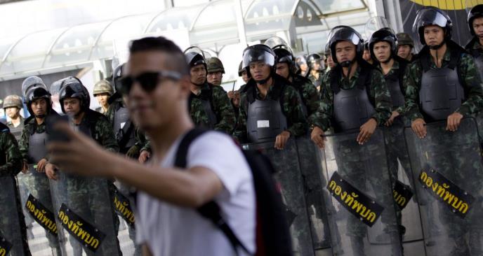 Tajjlandska vojska uvela je vanredno stanje 20. maja, a dva dana kasnije izvršila državni udar da bi prisilila na dijalog aktere sedmomesečne političke krize. Ustav je suspendovan, vlada i Senat raspušteni, bivša premijerka i oko 150 političara i aktivista su privedeni, a svako okupljanje zabranjeno.