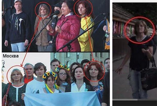 Dve žena jednom su predstavljene kao žiteljke Donbasa, drugi put kao Moskovljanke koja podržavaju Ukrajinu, a treći put kao žrtve milicije u Harkovu