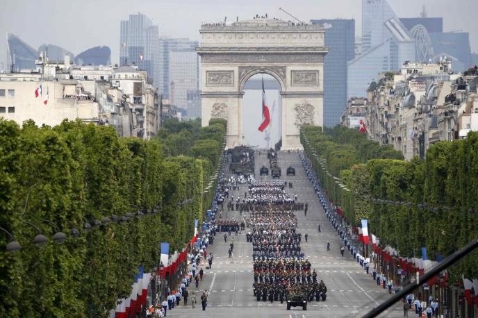 Francuski predsednik Fransoa Oland je uoči parade poslao poruku koja glasi: "Deset miliona vojnika je ubijeno ili podleglo zadobijenim ranama na bezbroj frontova. Mi im dugujemo zahvalnost". Vojnici su nosili zastave 76 zemalja i šetali Jelisejskim poljima.