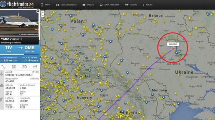 Kako se vidi na sajtu Flightradar jedan od aviona Montenegro erlajnza namerio se baš preko neba Ukrajine.