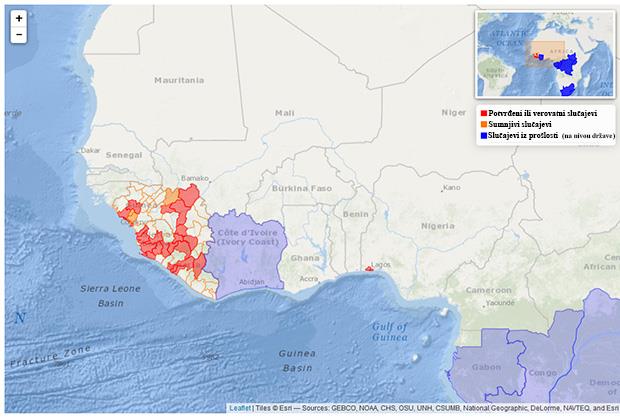 Na ovoj mapi prikazane su države u kojima su prijavljeni slučajevi ebole.