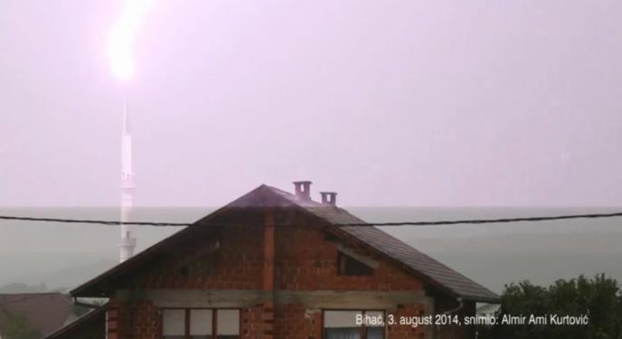 Na Jutjubu pojavio se snimak nevremena koje je juče takođe pogodilo Bihać. Jaka oluja praćena vetrom, obilnom kišom i grmljavinom napravilo je veliku štetu. Jedan od meštana snimio je trenutak kada je grom udario u minaret koji se nalazio na 300 metara od prvih kuća.