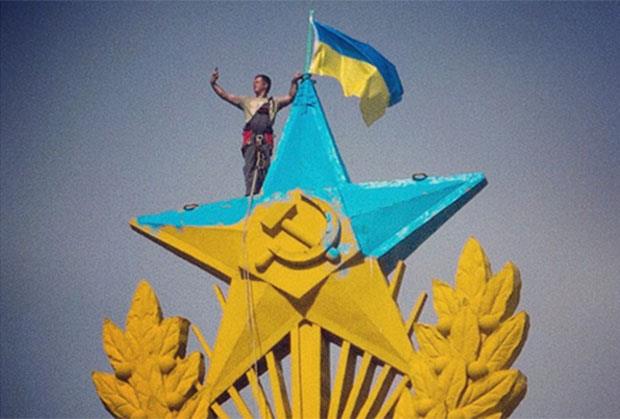 MOSKVA - Četiri osobe popele su se danas na poznatu zgradu Kotelničesku u Moskvi, razvili malu ukrajinski zastavu i u ukrajinske plavo-žute boje prefarbali zlatnu sovjetsku zvezdu petokraku.