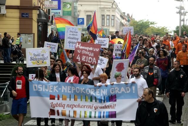 Učesnici su nosili i transparente na kojima je pisalo "Inati se Slavonijo", "Homofobija u svoja četiri zida" i "Tražimo osnovna ljudska prava". Skup je organizovalo udruženje LiberOs, a u povorci je bio i ministar privrede Ivan Vrdoljak, koji je iz Osijeka, kao i gosti iz susednih država, među njima i iz Srbije. Uoči prve osječke parade, u Zagrebu je sinoć sklopljen prvi gej brak u Hrvatskoj, odnosno životno partnerstvo. Sklopila su ga dvojica muškaraca koji su od hrvatske Vlade na poklon dobili po kravatu.