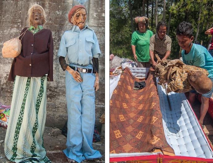 U mestu Toraja, u indonežanskoj regiji Južna Sulavesi, postoji neobičan obred prilikom kojeg meštati iskopavaju tela svojim mrtvih rođaka, pa ih kupaju, češljaju i oblače u novu moderniju garderobu.
