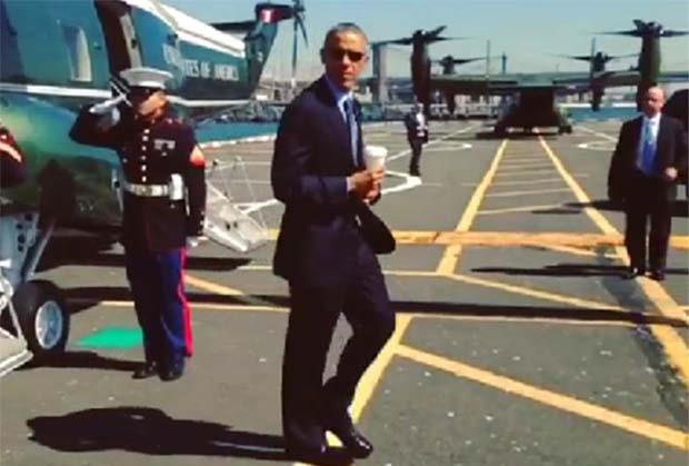Obama je silazio niz stepenice predsedničkog helikoptera "Air Force One", kojim je stigao u Njujork na Generalnu skupštinu UN, a vojnik je propisnim salutiranjem pozdravio svog predsednika, koji mu je nonšalantno odgovorio sa čašom u ruci.