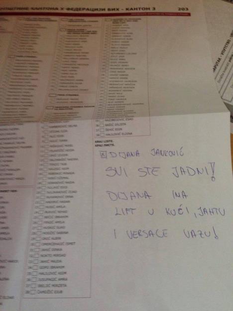 Osim pesama, bilo je i onih koji su izdvojili svoje vreme da svakom od kandidata za Predsedništvo BiH napišu šta misli o njemu, drugi su crtali, a jedan birač je poslao i poruku selektoru Fudbalske reprezentacije BiH Safetu Sušiću da ode.