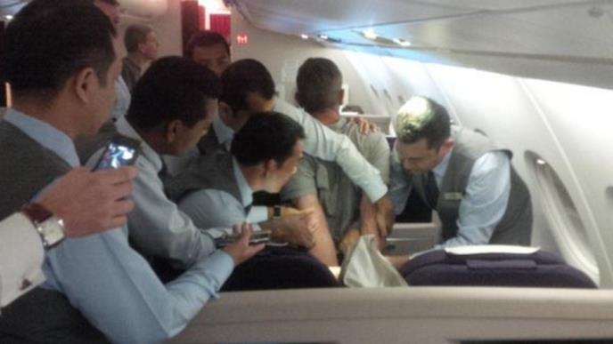 Muškarac je zatim postao nasilan pa je osoblje moralo da reaguje. Dok su pokušavali da ga savladaju, muškarac se otimao i pokušavao da ih udari glavom. Kad su sleteli, odvela ga je policija pod sumnjom da je pijan bio u avionu i da je napao člana posade.