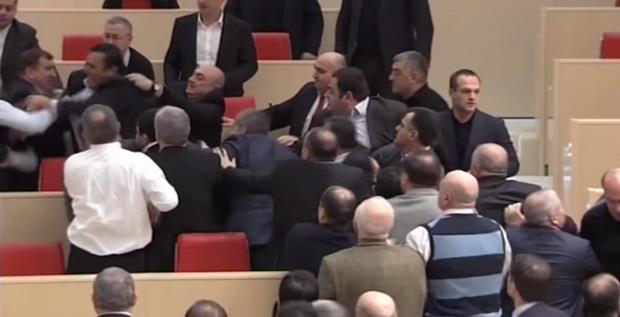 Do opšte tuče došlo je kada je opozicioni poslanik Akaki Bobokidze optužio vlast da vodi politiku majčice Rusije . U pesničenju povređena su tri poslanika.