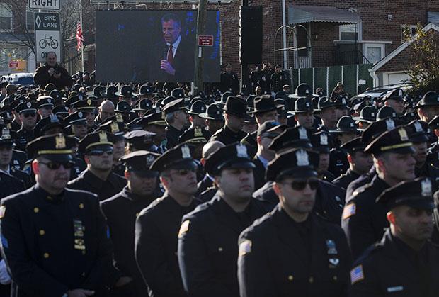 Reakcija policajaca, koji su iz cele zemlje došli da odaju počast nastradalom kolegi, usledila je posle reči zvaničnika policijskog sindikata, koji su naveli da je De Blazio doprineo atmosferi nepoverenja između policije i demonstranata koji su protestovali zbog policijske brutalnosti. De Blazio je ipak u crkvi, gde je održana služba policajcu Rafaelu Ramosu, dobio aplauz pre i posle govora.
