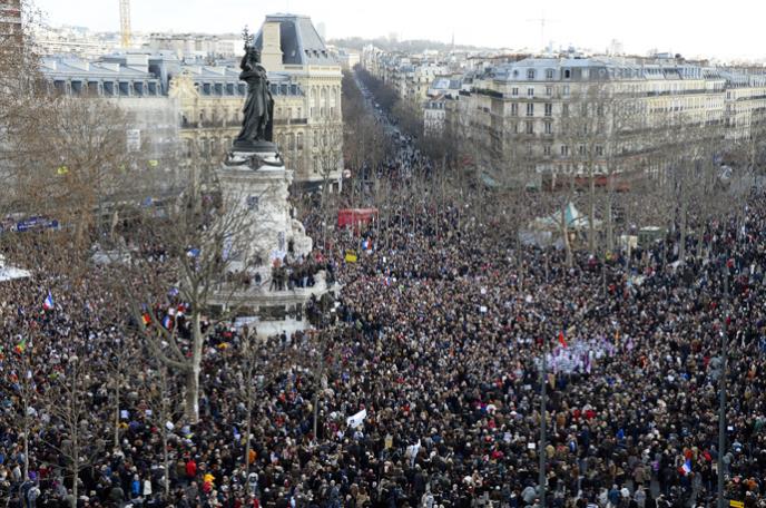 Marš u Parizu predvodili su svetski lideri, među kojima su predsednik Francuske Fransoa Oland, britanski premijer Dejvid Kameron i nemačka kancelarka Angela Merkel, i članovi porodica žrtava terorističkih napada u Francuskoj u proteklih nekoliko dana.