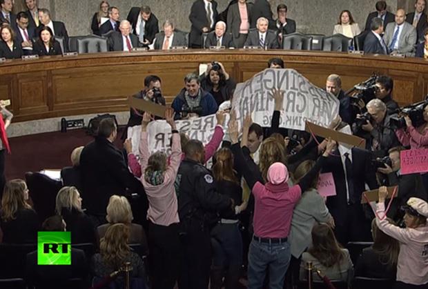 Skandal je izbio na jednom kongresnom saslušanju. Onog trenutka kad je u salu ušao bivši američki državni sekretar Henri Kisindžer, koji je trebalo da govori, ustala je grupica aktivista "Šifre ružičasto" (Code Pink), digla natpise "Uhapsite Kisindžera zbog ratnih zločina" i izvikivala parole.
