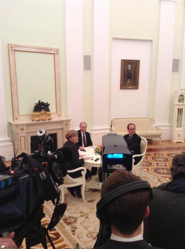 21.30 - Posle prvih sat i po razgovora, održanih "oči u oči" bez prisustva pomoćnika i novinara, Putin, Oland i Merkelova su došli do novinara, ali nisu dali izjave, već su samo omogućili fotoreporterima da naprave nekoliko snimaka. Zatim je razgovor nastavljen.