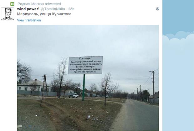 "Gospode! Urazumi ukrajinski narod i njegove vlasti da prekinu besmisleni bratoubilački rad. Oprosti nama grešnima!", piše na tabli postavljenoj u ulici Kurčatovoj.